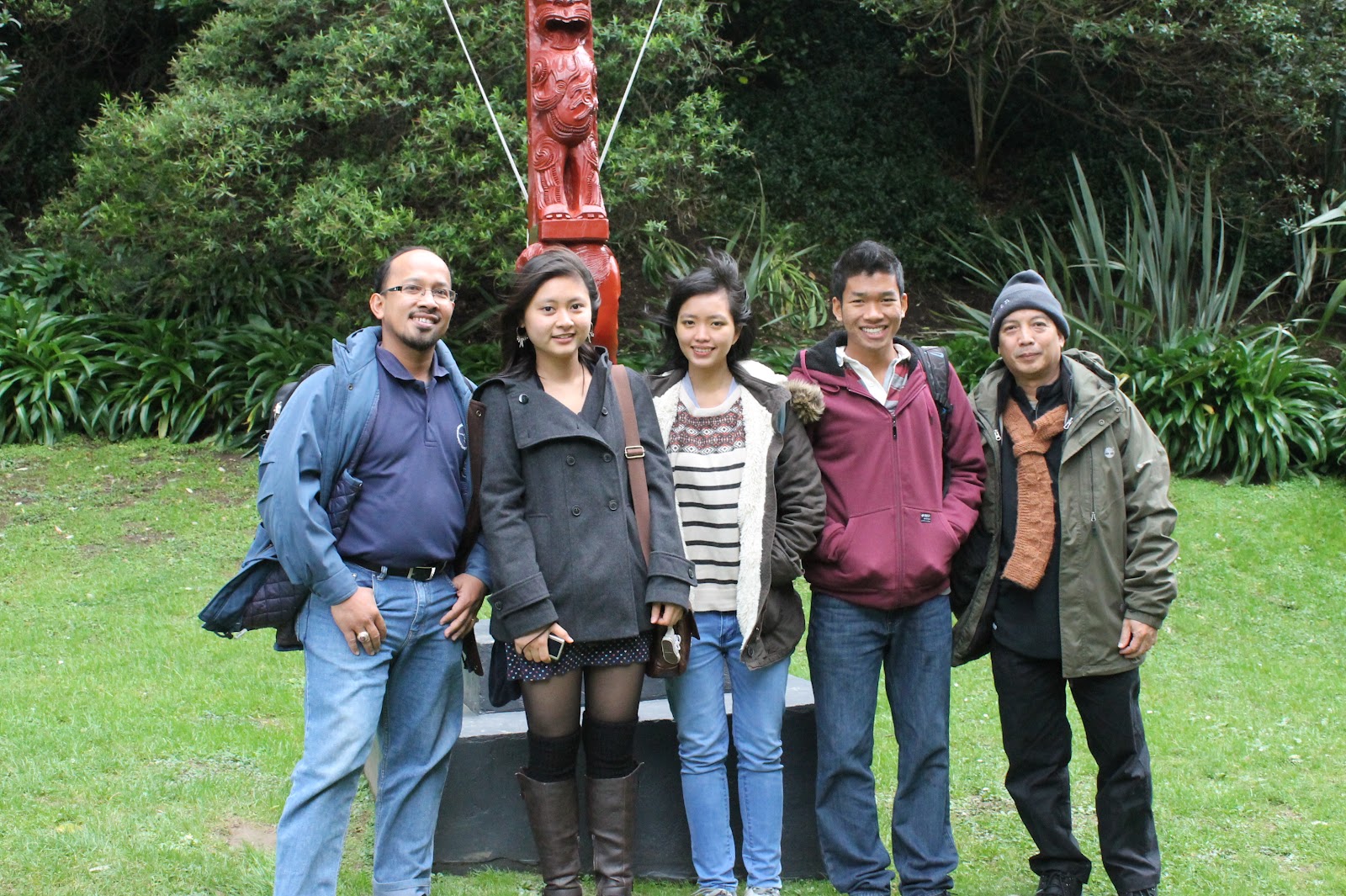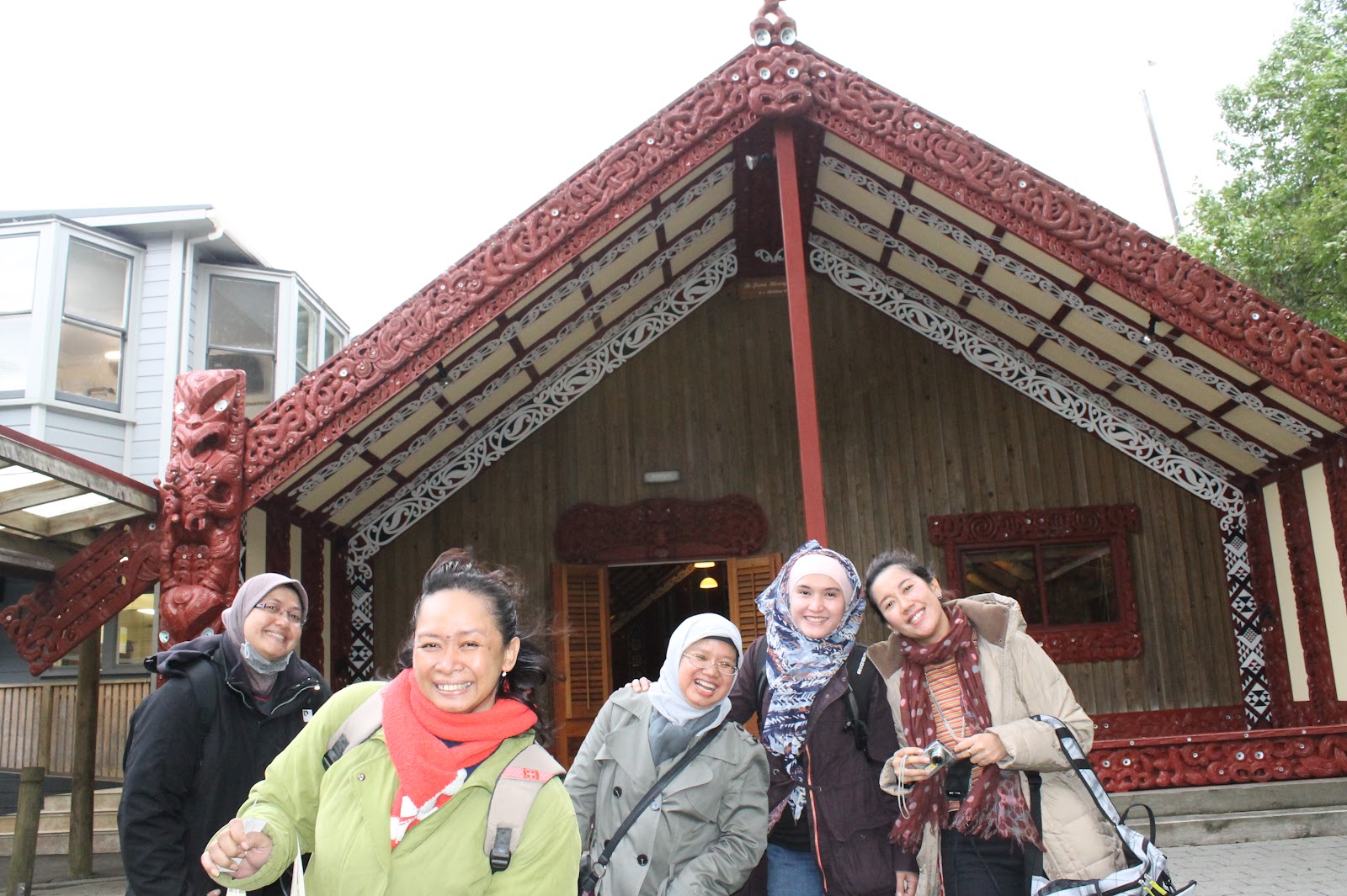 unik. Kami berkumpul di depan sebuah gerbang kayu penuh ukiran khas Maori