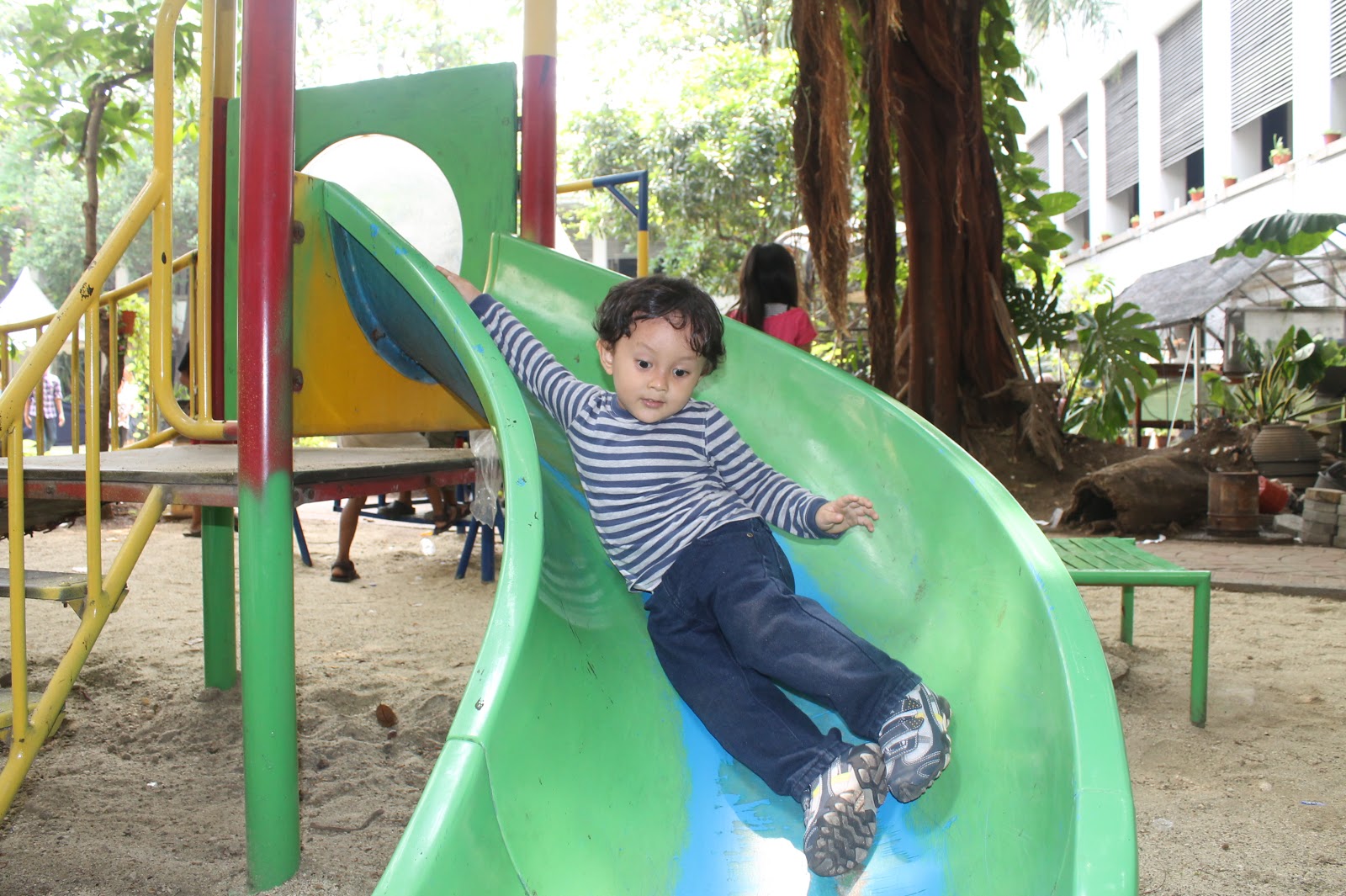 bentuk bangunan ini kotak dan bagian tengah bangunan ada ruang kosong seperti taman, pada saat kami datang ke museum ini sedang ada event dan terlihat ada panggung musik, yang membuat para keluarga senang mengunjungi meseum ini mungkin salah satunya ada playground atau taman bermain untuk anak-anak.. Keenan suka sekali, tanpa ijin bilang ke mama, langsung bermain prosotan.. (: