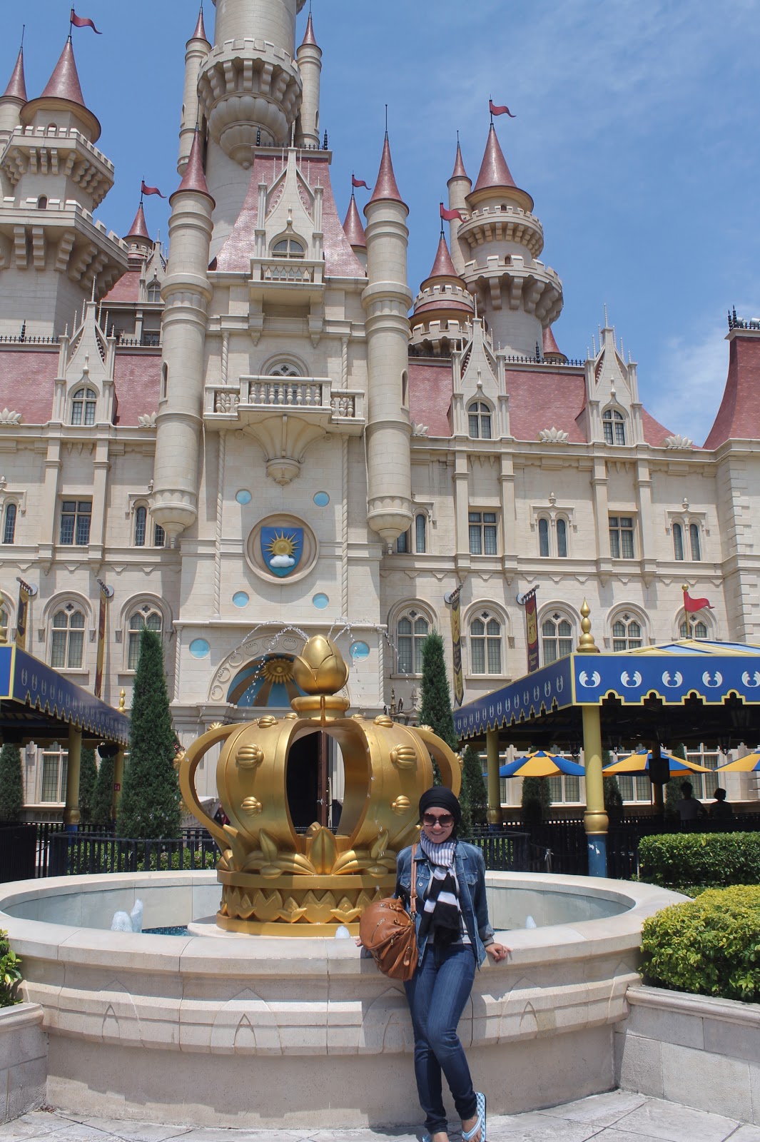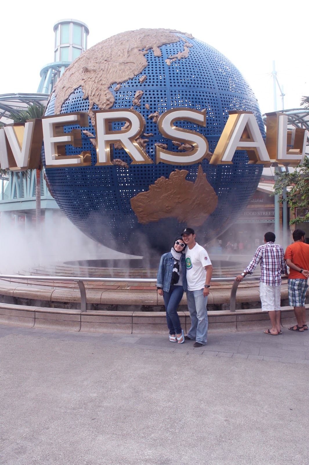 Untuk menuju USS, kami menggunakan Sentosa Express dari HarbourFront, biayanya 3,5 SGD per orang. Setibanya di USS langsung dapat melihat bola dunia dengan tulisan Universal Studio. Ini adalah maskot Universal Studio. Banyak pengunjung yang berfoto dengan background bola dunia ini, baik yang memang memiliki tiket masuk USS maupun tidak memiliki tiket masuk USS.