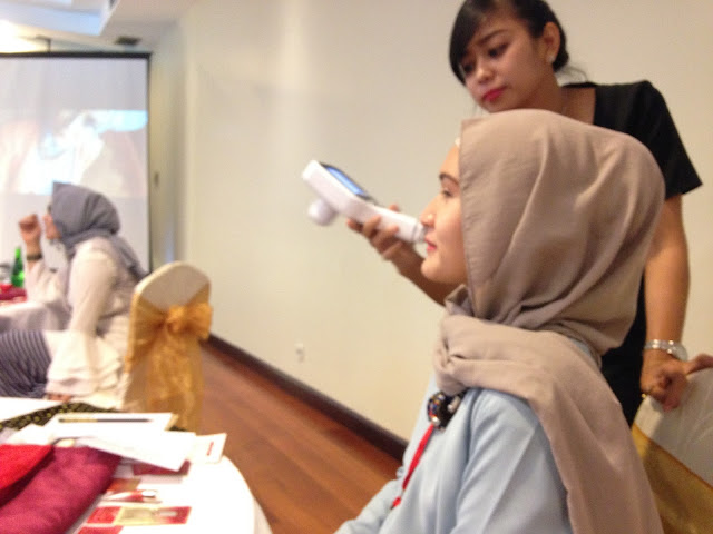 Sebelum praktek makeup, seluruh peserta wajib mengikuti skin check terlebih dahulu, tujuannya adalah untuk mengetahui kondisi kulit wajah kita saat ini, yaitu untuk pigmentation, sebum, moisture dan elasticity. Hasil skin check juga untuk memudahkan kita mengetahui jenis produk mana yang cocok untuk kulit sehingga dapat disesuaikan dengan kebutuhan kulit wajah masing-masing peserta.